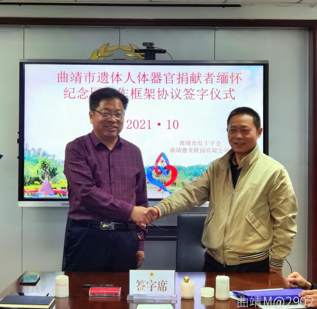 10月13日,曲靖市紅十字會(huì)舉行曲靖市遺體人體器官捐獻(xiàn)者緬懷紀(jì)念園項(xiàng)目建設(shè)簽約儀式,曲靖市紅十字會(huì)與曲靖德龍陵園有限公司正式簽訂了項(xiàng)目建設(shè)協(xié)議書(shū)。該紀(jì)念園的建成是我市首個(gè),云南省第五個(gè)遺體人體器官捐獻(xiàn)者紀(jì)念園。市紅十字會(huì)干部職工、志愿者代表,曲靖德龍陵園有限公司董事長(zhǎng),總經(jīng)理參加簽約儀式。